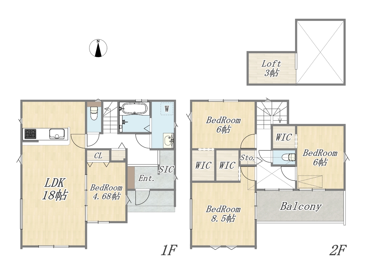 | 間取 | 3LDK+3WIC+SIC+Loft+ワイドバルコニー+カースペース2台 (LDK18帖、洋室8.5帖、洋室6帖、洋室6帖、洋室4.68帖) | ||