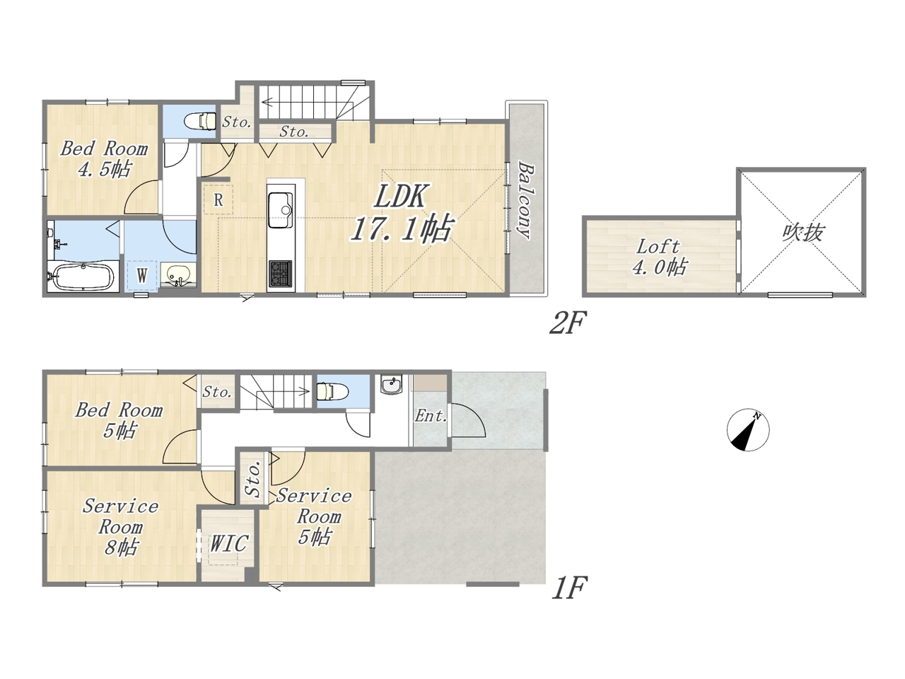| 間取 | 2LDK+2S+ロフト+ビルトインガレージ (LDK17.16帖、洋室5帖、洋室4.5帖、S8帖、S5帖) | ||