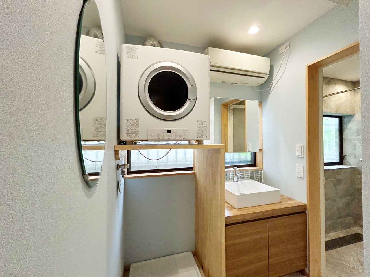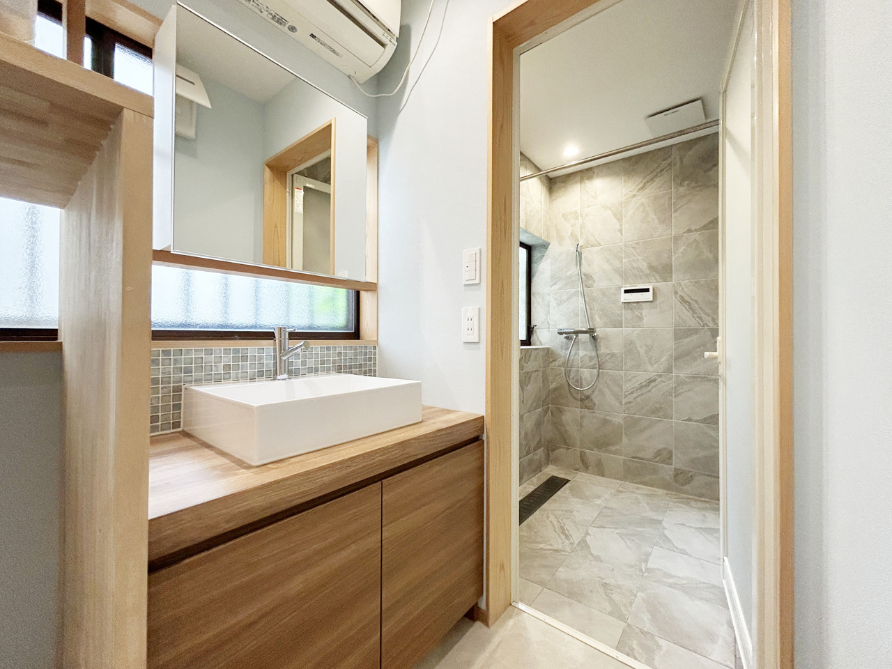【Wash Room】 機能美とデザイン性を両立させた3面境仕上げの洗面化粧台。 視覚的に広がり感を持たせるだけでなく、機能的にも優れています。