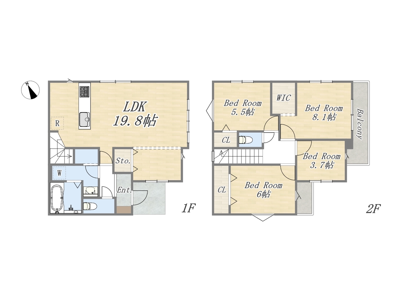 | 間取 | 4LDK+WIC+カースペース2台可 (LDK19.8帖、洋室8.1帖、洋室6帖、洋室5.5帖、洋室3.7帖) | ||