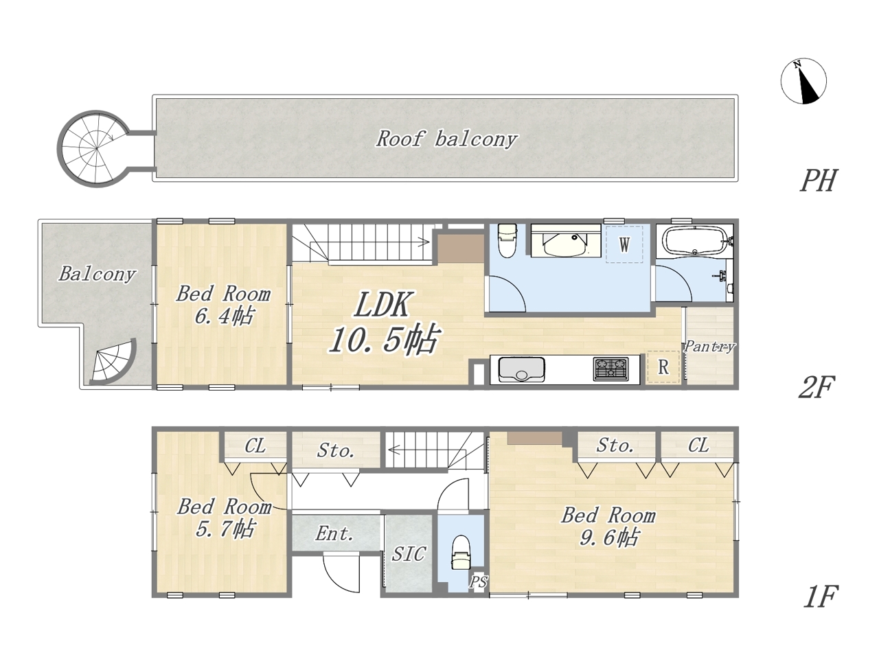 | 間取 | 3LDK+SIC+pantry+ルーフバルコニー (LDK10.5帖、洋室9.6帖、洋室6.4帖、洋室5.7帖) | ||