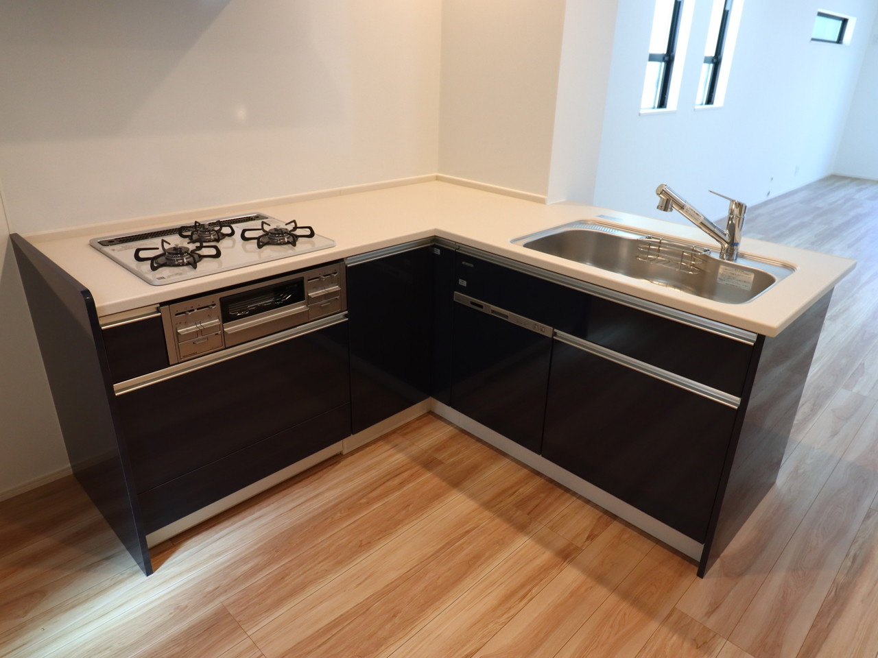 【Kitchen A号棟】 食洗器搭載のシステムキッチン。 家事の効率化が図れ、空いた時間に他の作業や家族との団らんを愉しめます。
