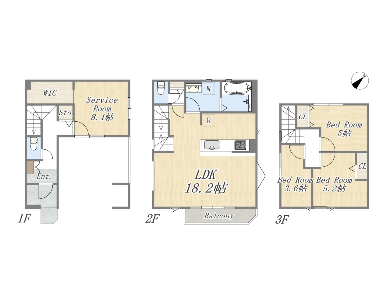 | 間取 | 3SLDK+WIC+ビルトインガレージ (LDK18.2帖、洋室5.2帖、洋室5帖、洋室3.6帖、S8.4帖) | ||