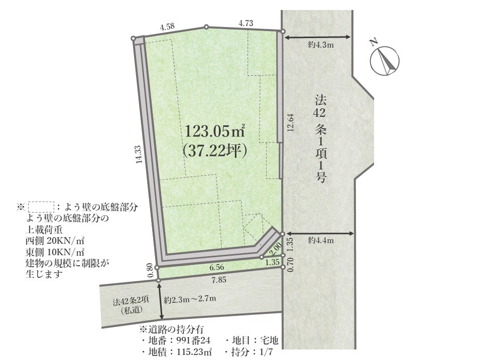 | 土地面積 | 123.05m² 公簿 (私道115.23m²別に有、私道持分比率:1/7、セットバック5.95m²) | ||