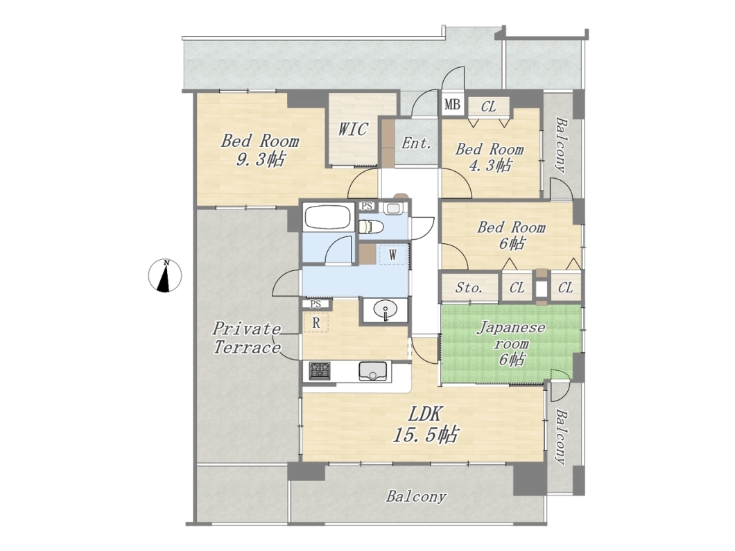 | 間取 | 4LDK+WIC+プライベートテラス (LDK14.5帖、洋室9.3帖、洋室6帖、洋室4.3帖、和室6帖) |