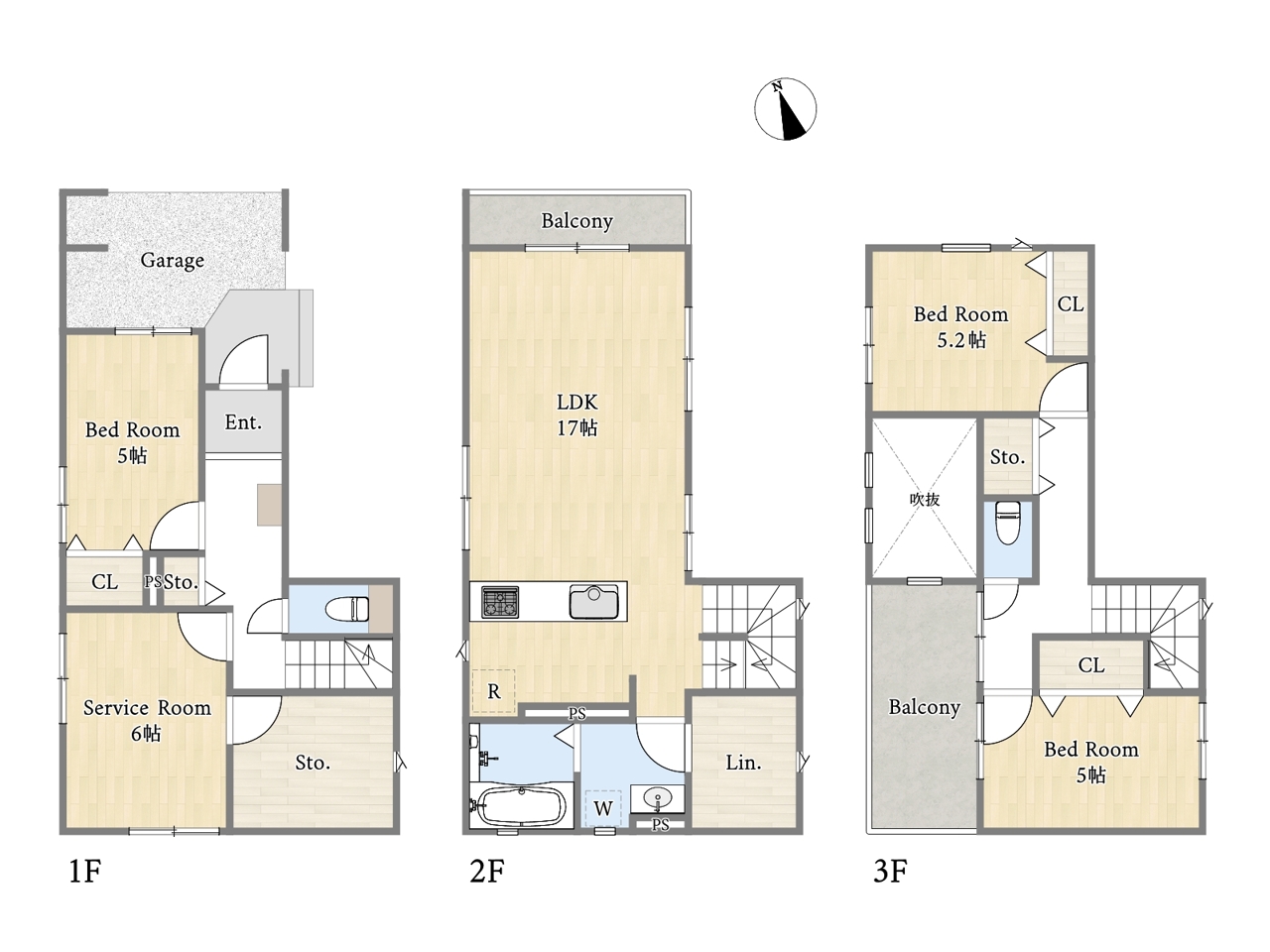 | 間取 | 3SLDK+リネン庫+ワイドバルコニー (LDK17帖、洋室5.2帖、洋室5帖、洋室5帖、S6帖) | ||