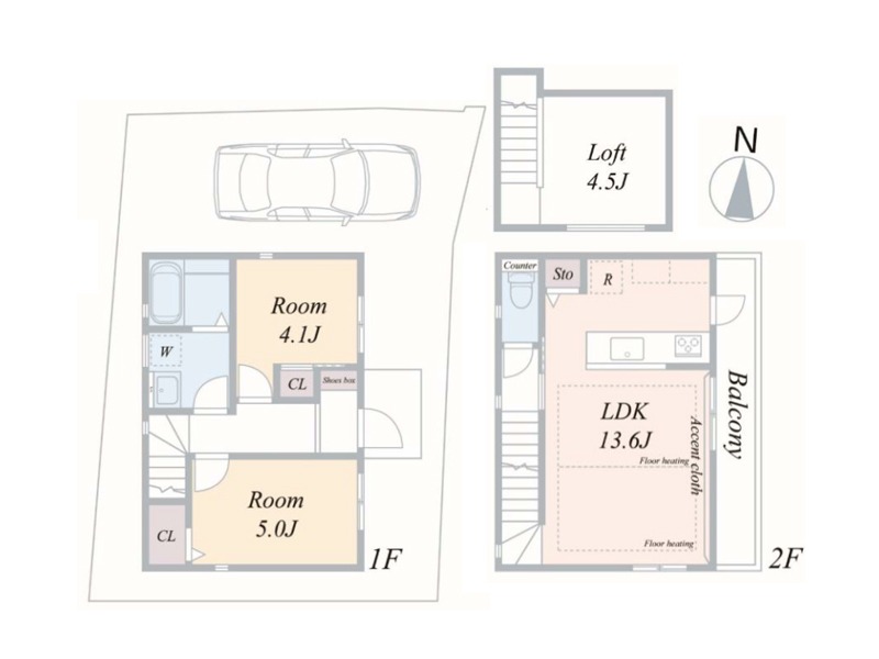 | 間取 | 2LDK+ロフト+カースペース (LDK13.6帖、洋室5.0帖、洋室4.1帖) | ||