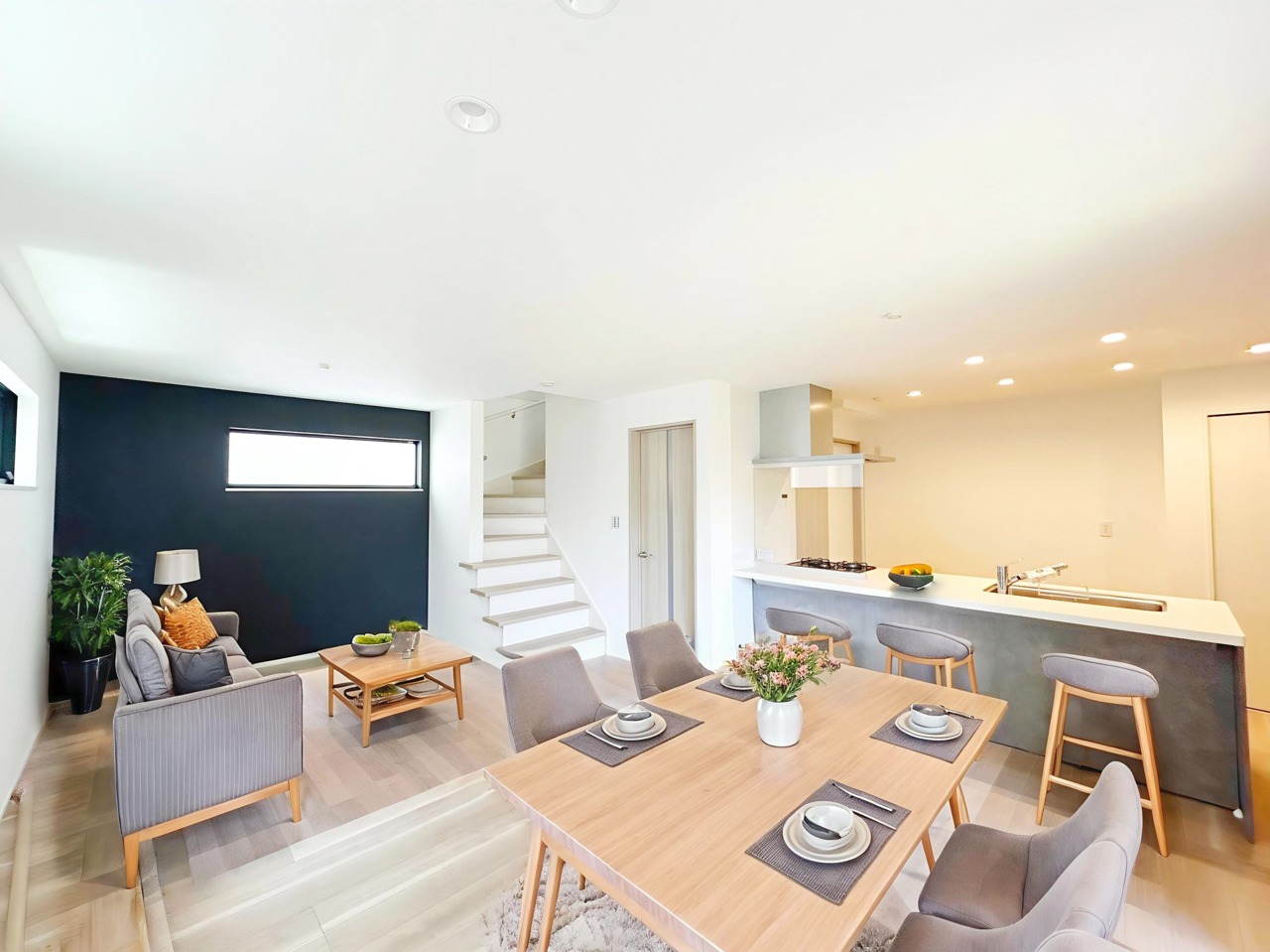 POINT1. 視線を気にせずくつろげる2階リビングはカウンターキッチンとリビング階段で家族間のコミュニケーションを重視したプランニング。
