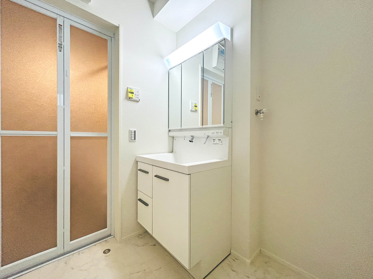 【Wash Room】 機能美とデザイン性を両立させた3面境仕上げの洗面化粧台。 視覚的に広がり感を持たせるだけでなく、機能的にも優れています。