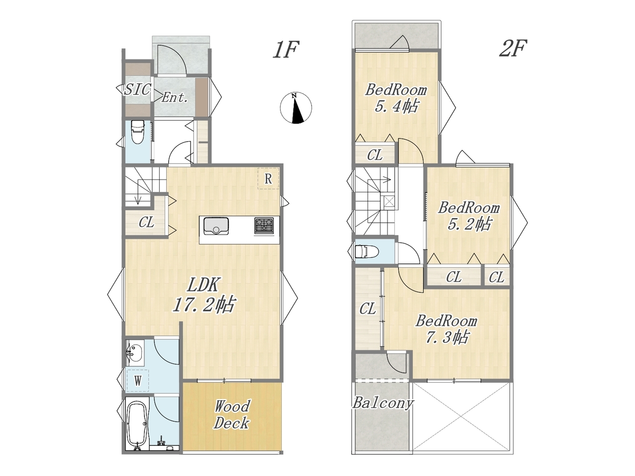 | 間取 | 3LDK+SIC+Pantry+ウッドデッキ+ワイドバルコニー+カースペース (LDK17.2帖、洋室7.3帖、洋室5.4帖、洋室5.2帖) | ||