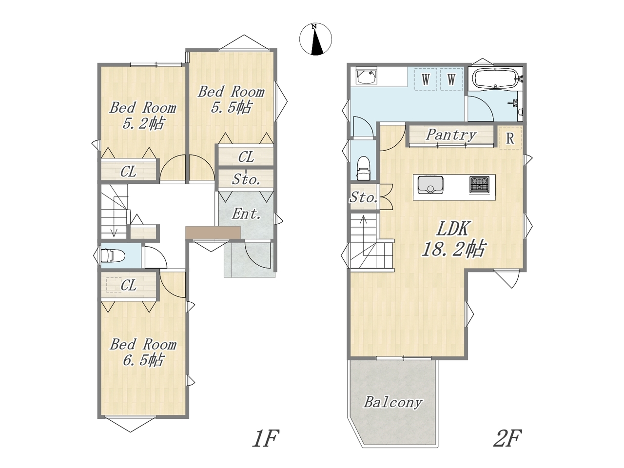 | 間取 | 3LDK+Pantry+カースペース (LDK18.2帖、洋室6.5帖、洋室5.5帖、洋室5.2帖) | ||