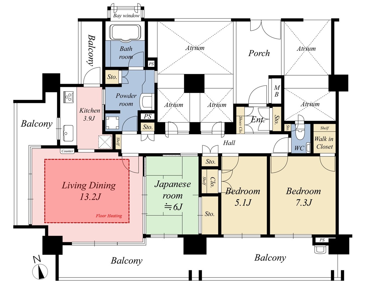 | 間取 | 3LDK + WIC+ワイドバルコニー (LDK17.1帖、洋室7.3帖、洋室5.1帖、和室6.0帖) | ||
