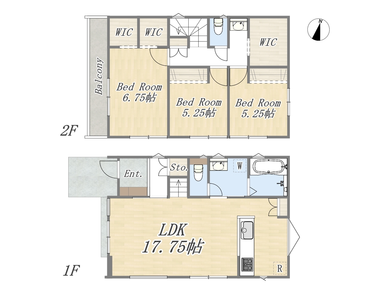 | 間取 | 3LDK+3WIC+カースペース2台 (LDK17.75帖、洋室6.75帖、洋室5.25帖、洋室5.25帖) | ||