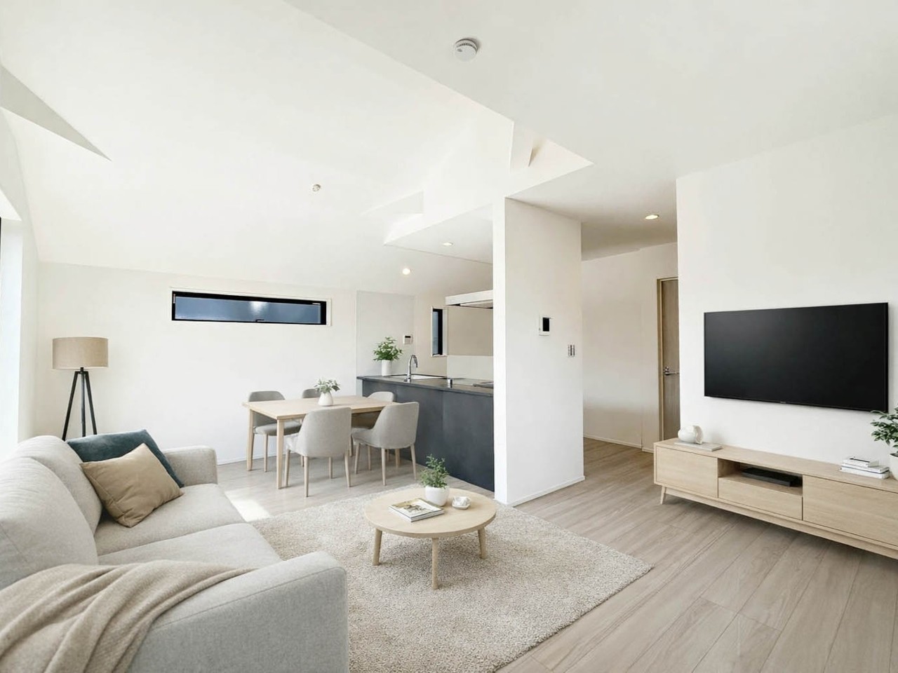2号棟 【LDK:16.6帖】 白い壁と木目が調和する、温かみと広がりを感じさせる空間。自然と家族や友人との語らいが弾む、心地よいひとときがここから始まります 本画像はCGで作成しており、実際に現地に家具は配置しておりません。