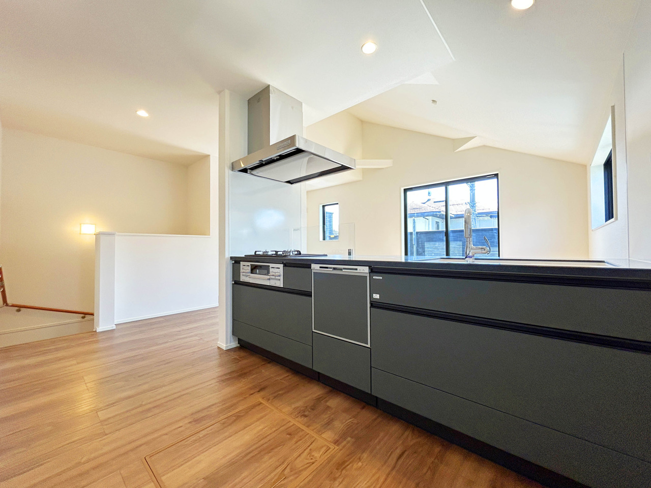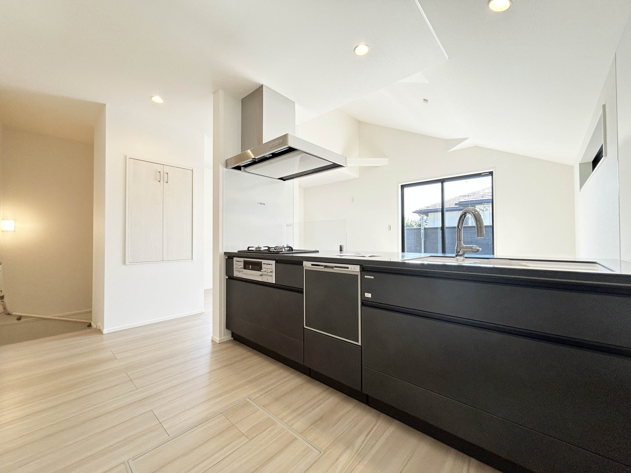 1号棟 【Kitchen】 洗練されたモノトーンでまとめられた空間は、都会的で落ち着いた雰囲気を醸し出します。機能美あふれるキッチンは、日々の暮らしに心地よいリズムをもたらしてくれるでしょう。窓から自然な明るさが広がり、穏やかな時間が流れます