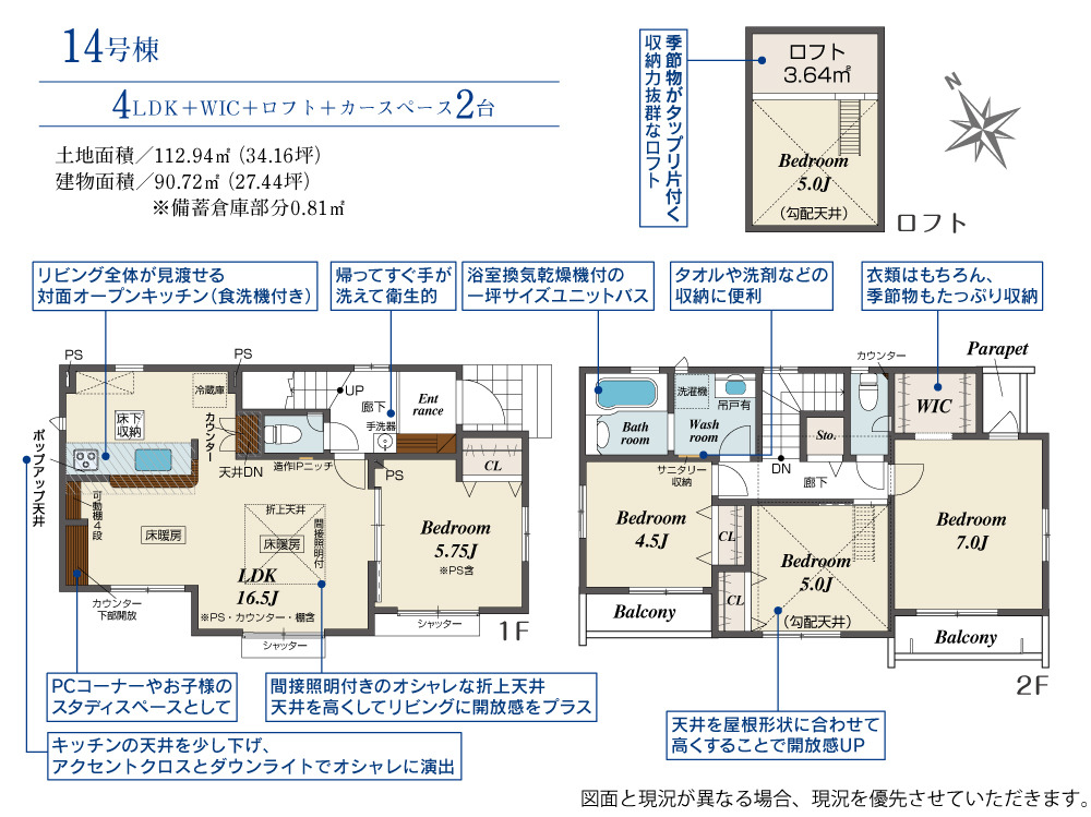 | 間取 | 4LDK+WIC+Loft+カースペース (LDK16.5帖、洋室7帖、洋室5.75帖、洋室5帖、洋室4.5帖) | ||
