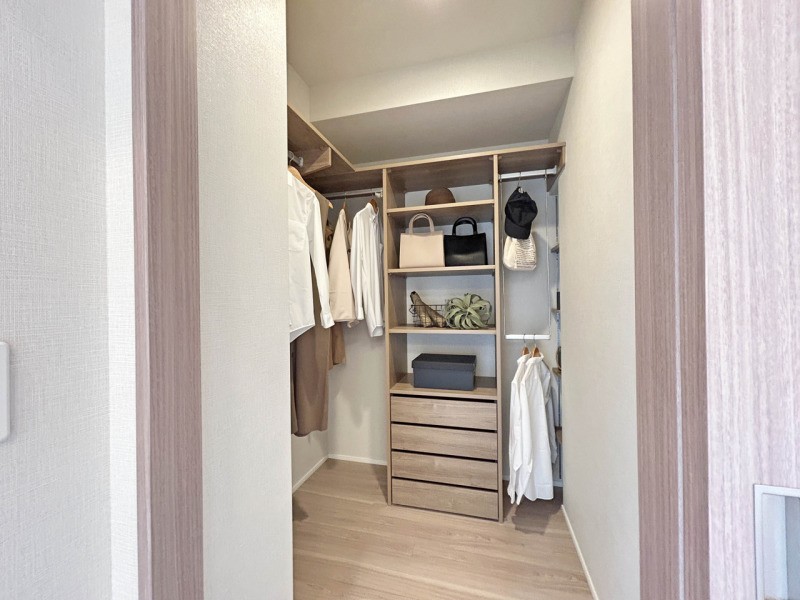 【ウォークインクローゼット】スペースが確保されているため、アイテムごとに収納を分けて整理することができます。棚やハンガーパイプ、引き出しを配置することで、衣類や小物を見やすく、取り出しやすくできます。