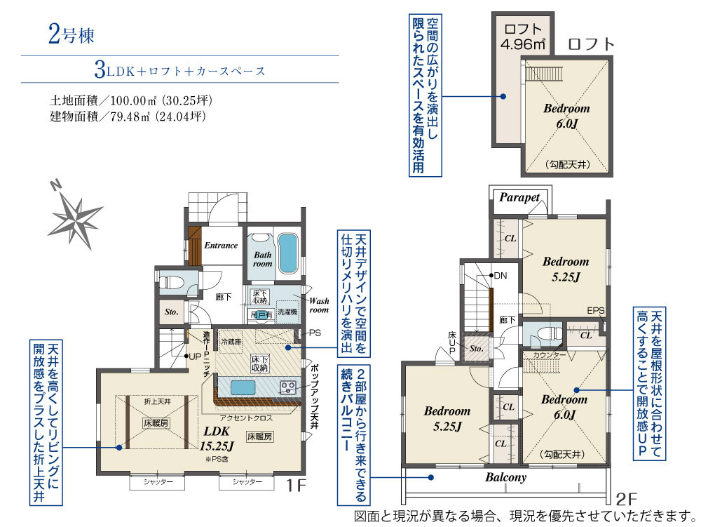 | 間取 | 3LDK + ロフト+床下収納×2 (LDK15.25帖、洋室6.00帖、洋室5.25帖、洋室5.25帖) | ||