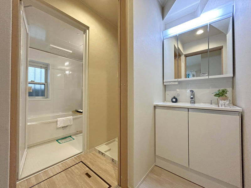 【Wash Room】機能美とデザイン性を両立させた3面境仕上げの洗面化粧台。視覚的に広がり感を持たせるだけでなく、機能的にも優れています。