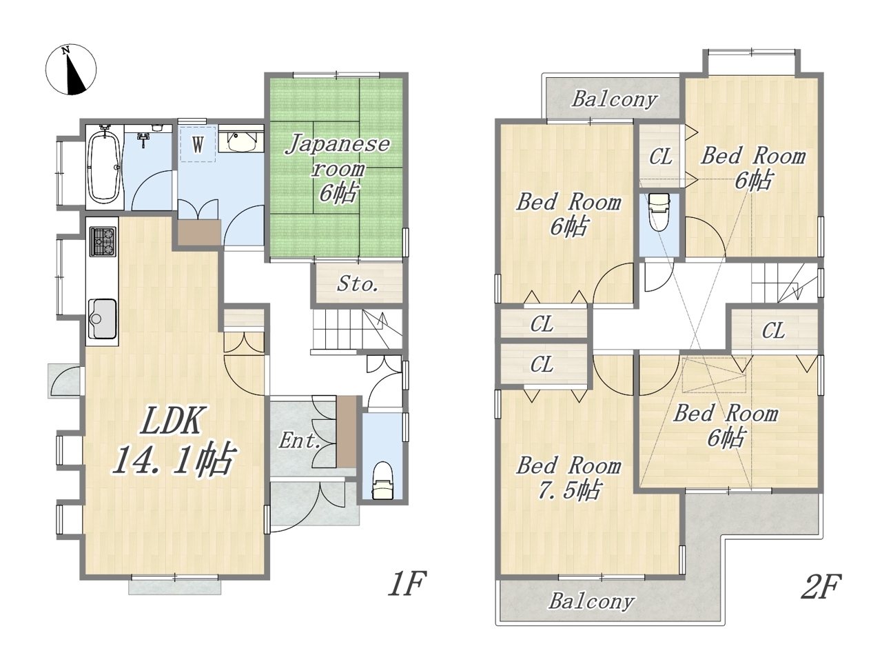 | 間取 | 5LDK+小屋裏収納+カースペース2台可 (LDK14.1帖、洋室7.5帖、洋室6帖、洋室6帖、洋室6帖、和室6帖) | ||