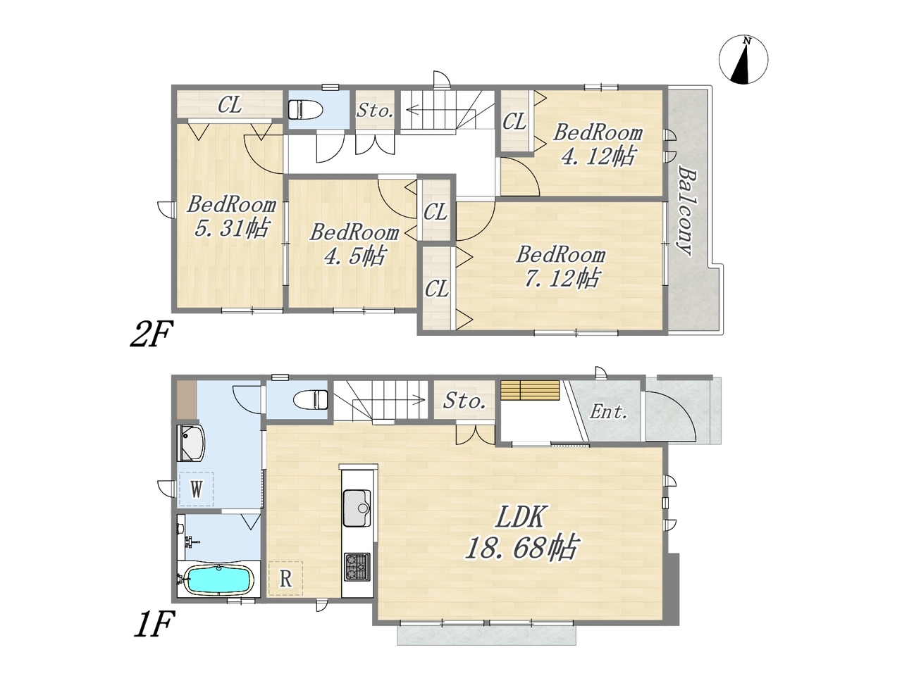 | 間取 | 4LDK+カースペース2台 (LDK18.68帖、洋室7.12帖、洋室5.31帖、洋室4.5帖、洋室4.12帖) | ||