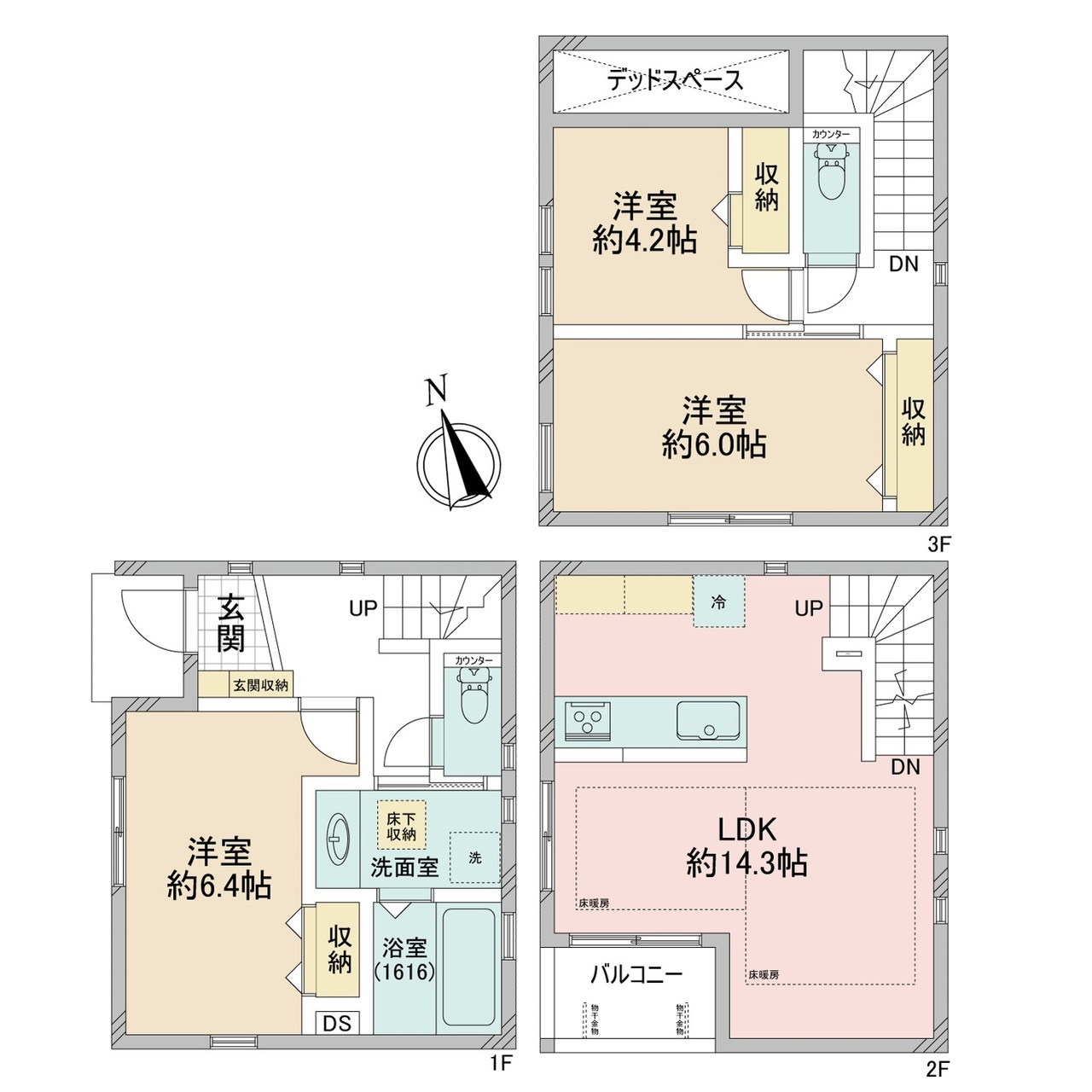 | 間取 | 3LDK (LDK14.3帖、洋室6.4帖、洋室6帖、洋室4.2帖) | ||