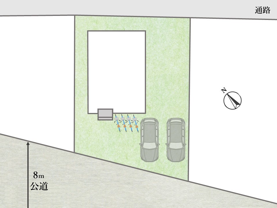 前面道路は南西側公道8mと開放的な立地、各区画に収納豊富な3SLDKの参考建物プランをご用意しております!
