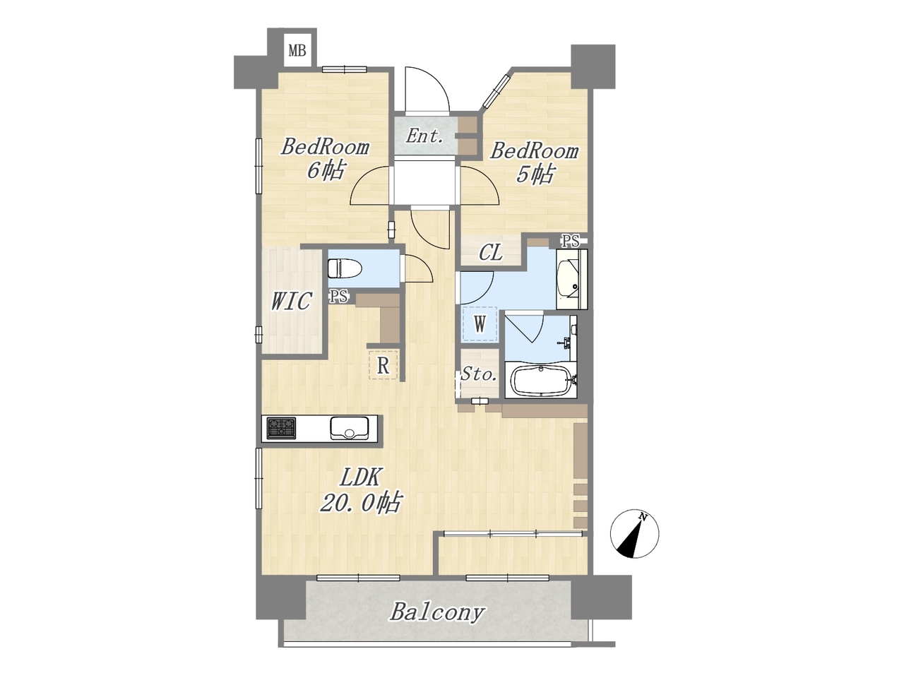| 間取 | 2LDK+WIC+ワイドバルコニー (LDK20帖、洋室6帖、洋室5帖) | ||