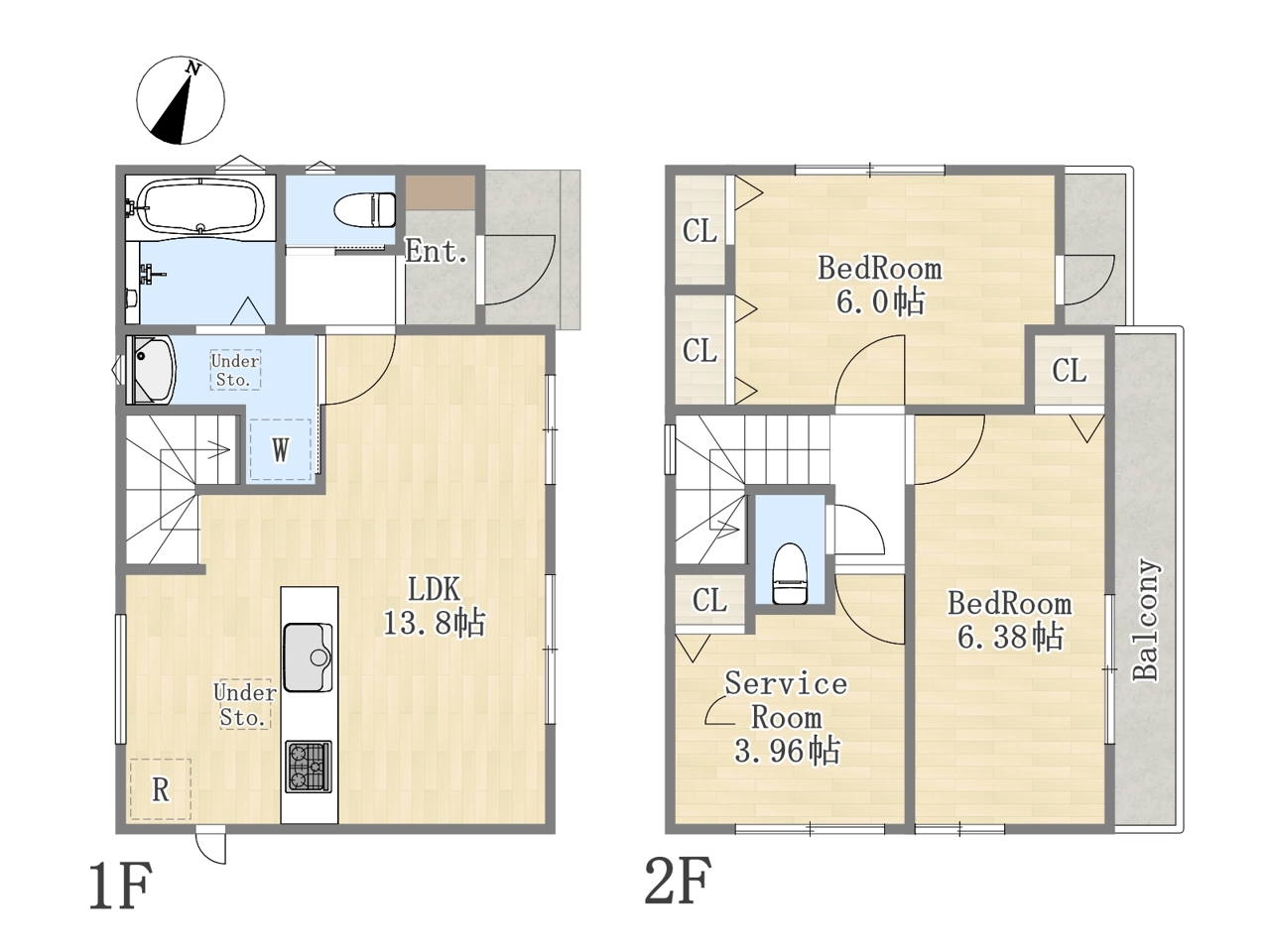 | 間取 | 2SLDK (LDK13.8帖、洋室6.38帖、洋室6.0帖、S3.96帖) | ||