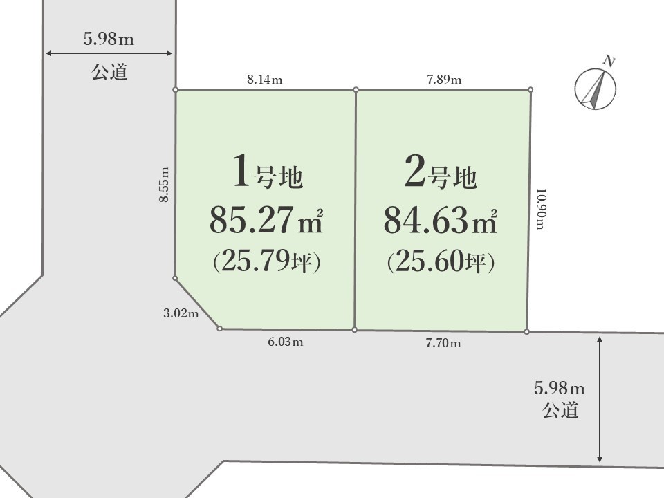 開放的な南西5.98m×5.98mの2方公道に面した陽当り・通風が確保された限定2区画が誕生!
