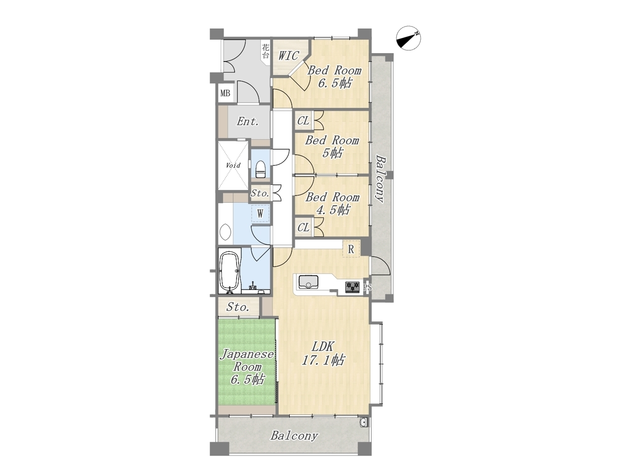 和室がある4LDKの間取り。LDK17.1帖のLD部分には床暖房が搭載されており、冬場の寒い時期でも足元から温まることができます。