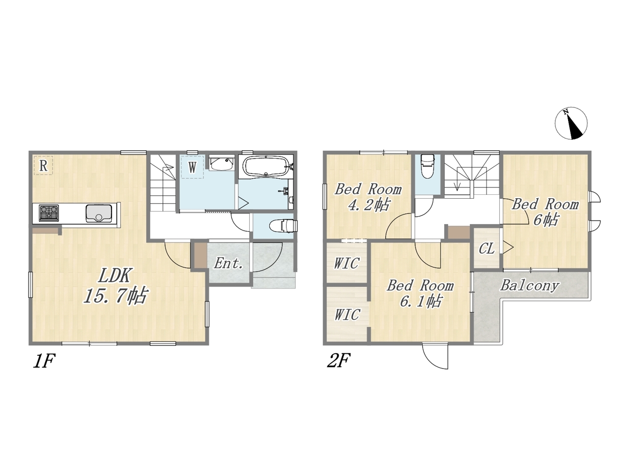 | 間取 | 3LDK+2WIC+カースペース2台 (LDK15.7帖、洋室6.1帖、洋室6帖、洋室4.2帖) | ||