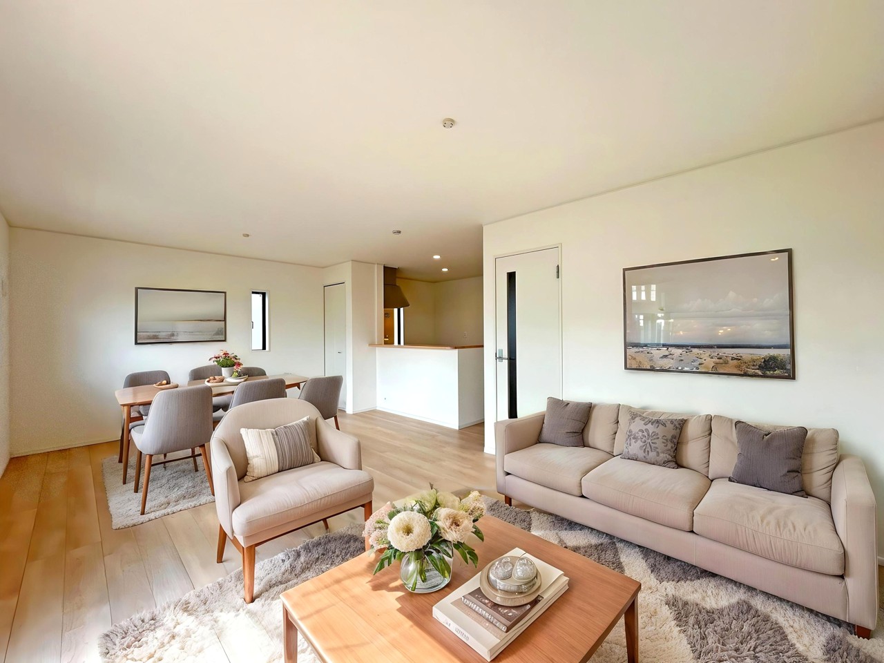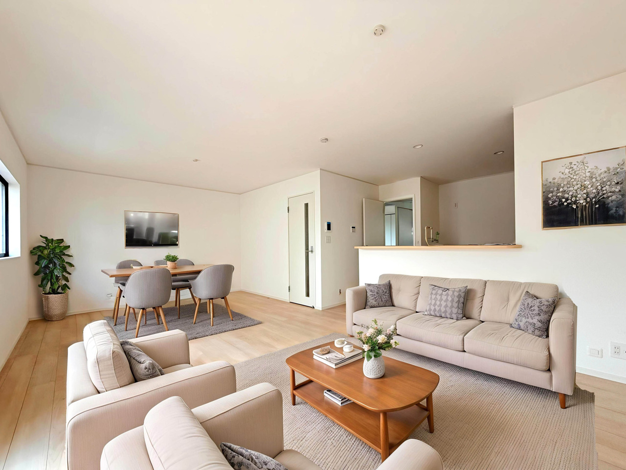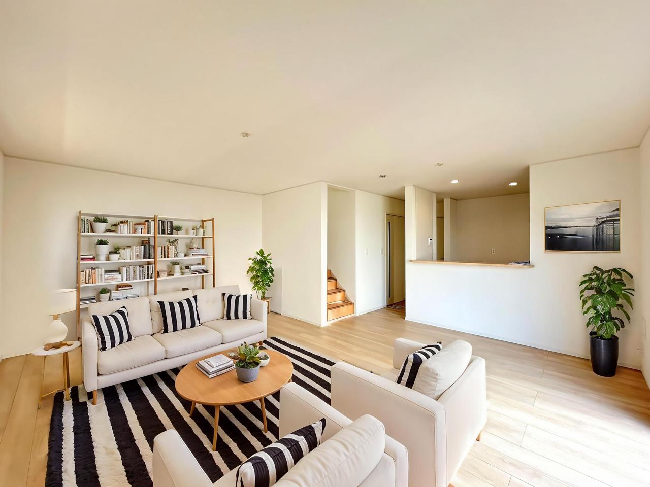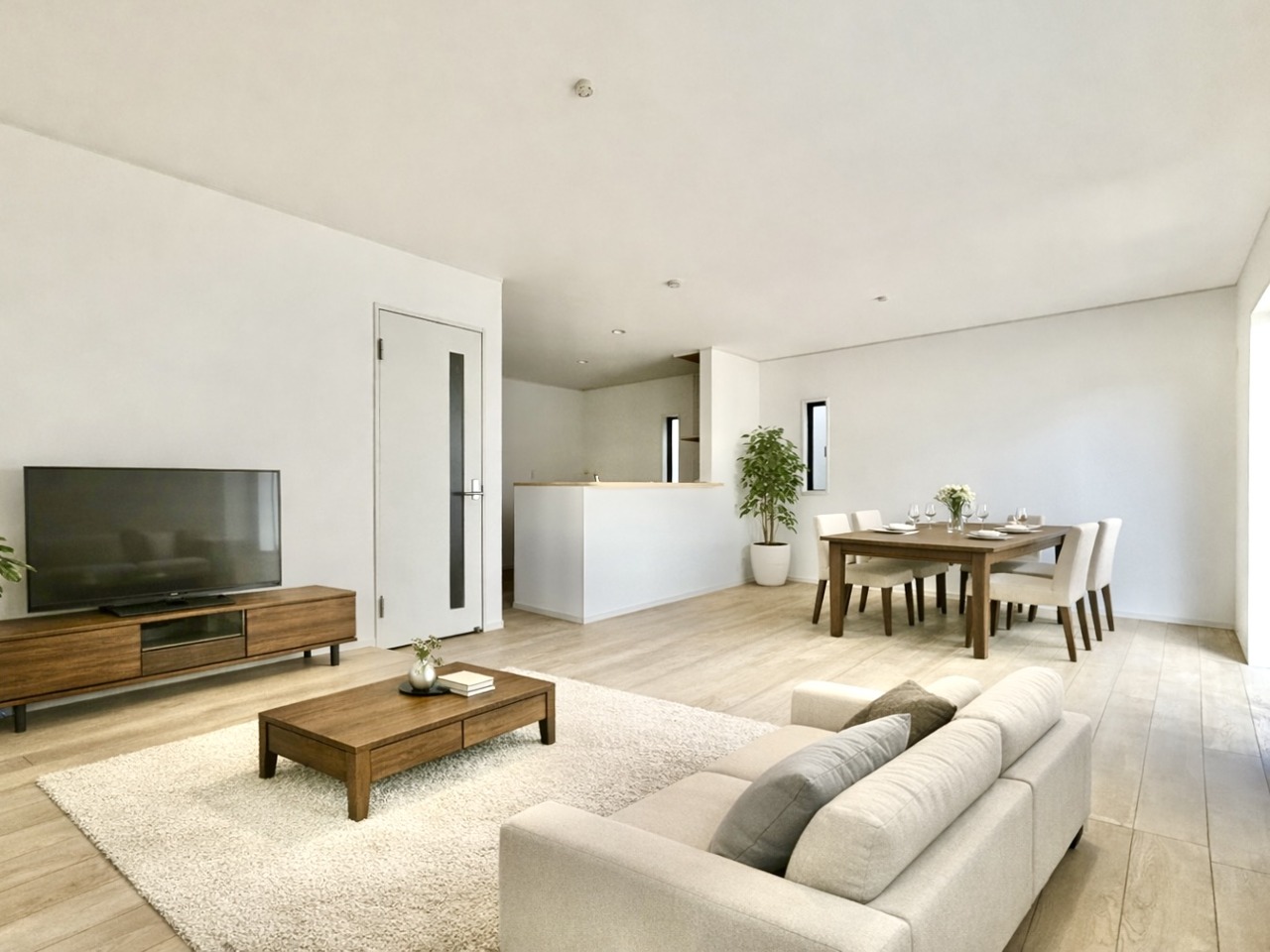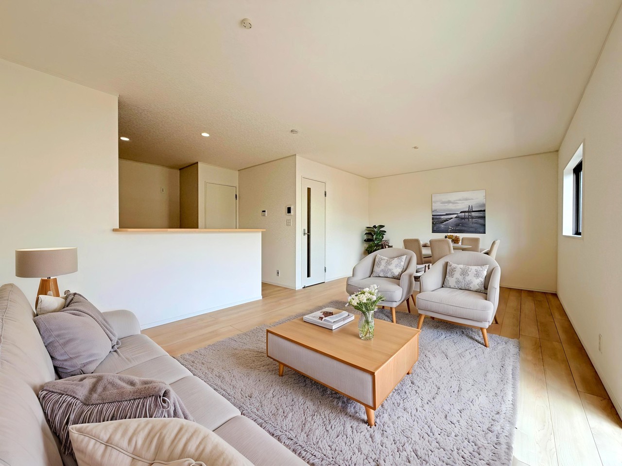 4号棟 【LDK:19.5帖】 柔らかな空気感が心地よい、穏やかな暮らしの空間。 本画像はCGで作成しており、実際に現地に家具は配置しておりません。また、価格に家具は含まれません。