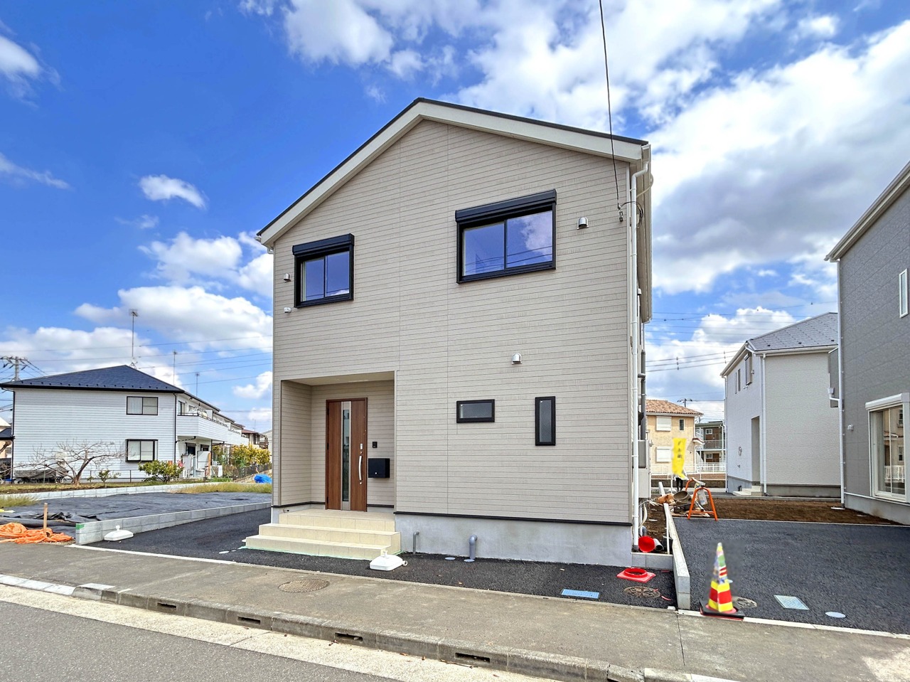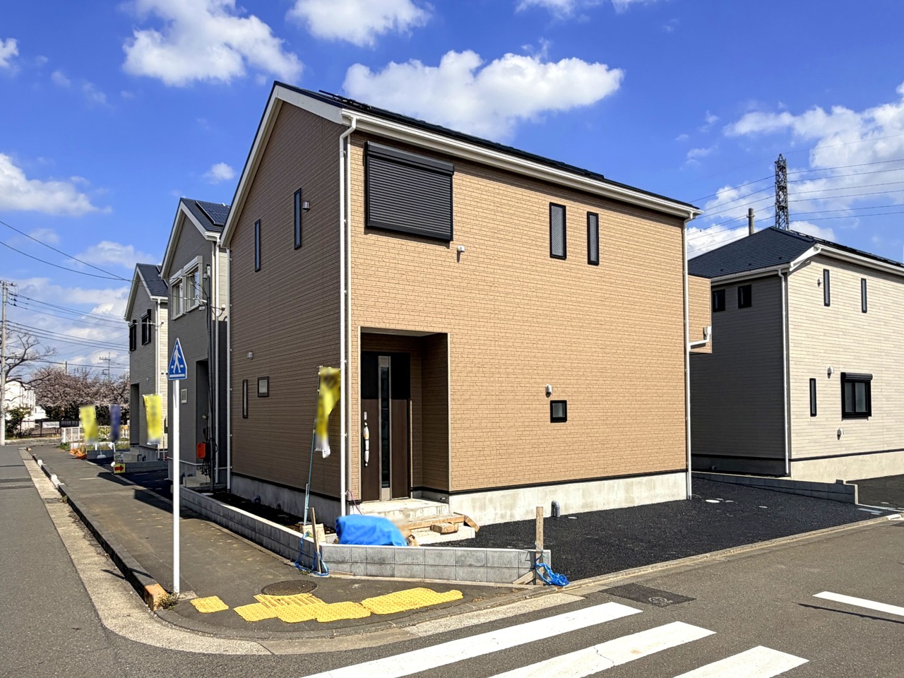 4号棟 【外観】 青い空と白い雲が広がる穏やかな風景に佇む、温かみのある外観の住まい。街並みに溶け込み、心地よい日常を予感させます。