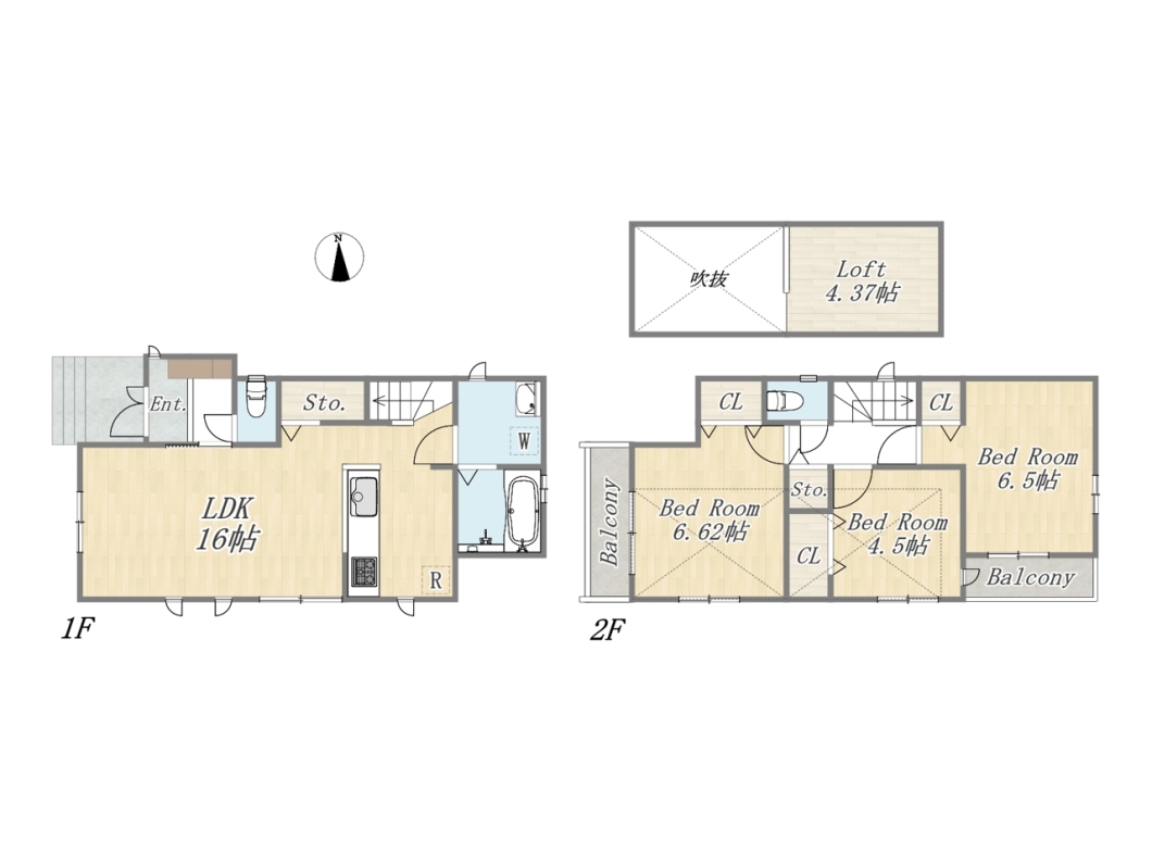 | 間取 | 3LDK+Loft+カースペース2台可 (LDK16帖、洋室6.62帖、洋室6.5帖、洋室4.5帖) |