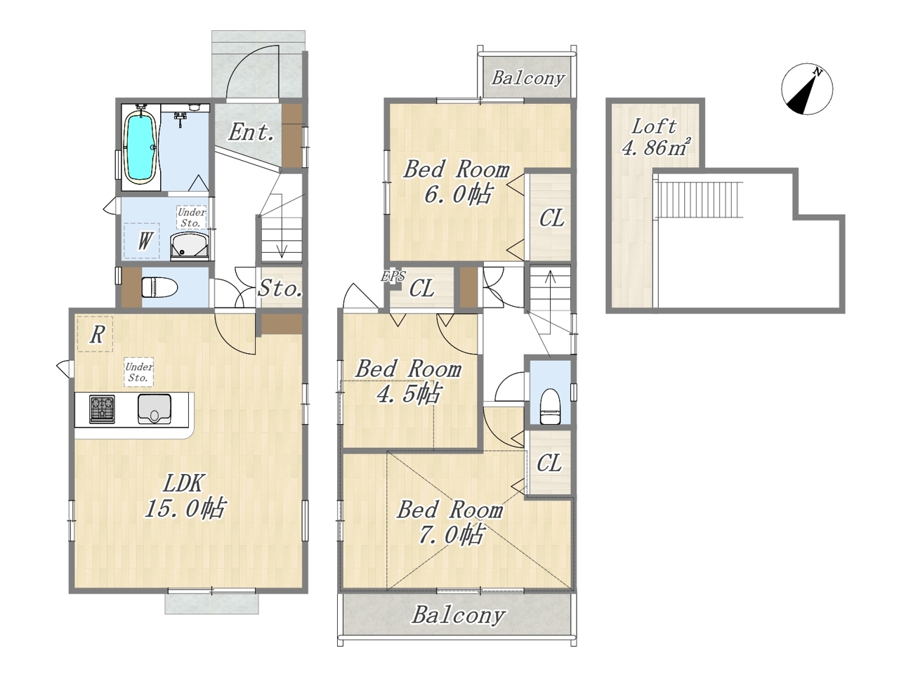 | 間取 | 3LDK + ロフト+床下収納 (LDK15.0帖、洋室7.0帖、洋室6.0帖、洋室4.5帖) | ||