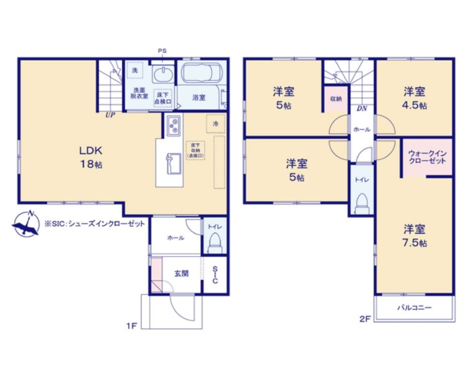 | 間取 | 4LDK+WIC+SIC+カースペース2台 (LDK18帖、洋室7.5帖、洋室5帖、洋室5帖、洋室4.5帖) | ||