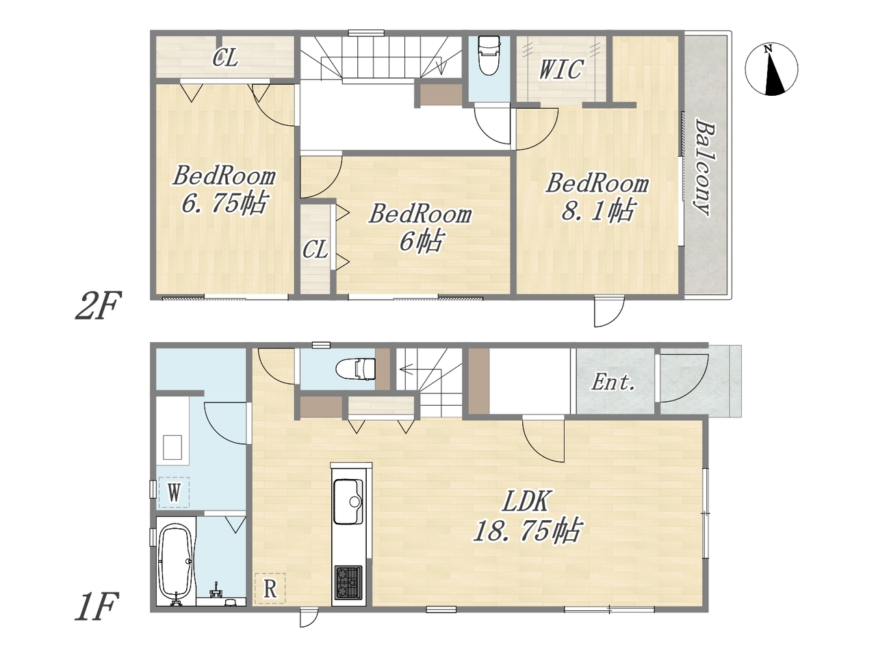 | 間取 | 3LDK+WIC+Pantry+カースペース2台 (LDK18.75帖、洋室8.1帖、洋室6.75帖、洋室6帖) | ||