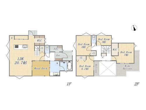 | 間取 | 4LDK+2WIC+SIC+Pantry+ウッドデッキ (LDK20.7帖、洋室6.2帖、洋室6帖、洋室7帖、洋室3帖) | ||