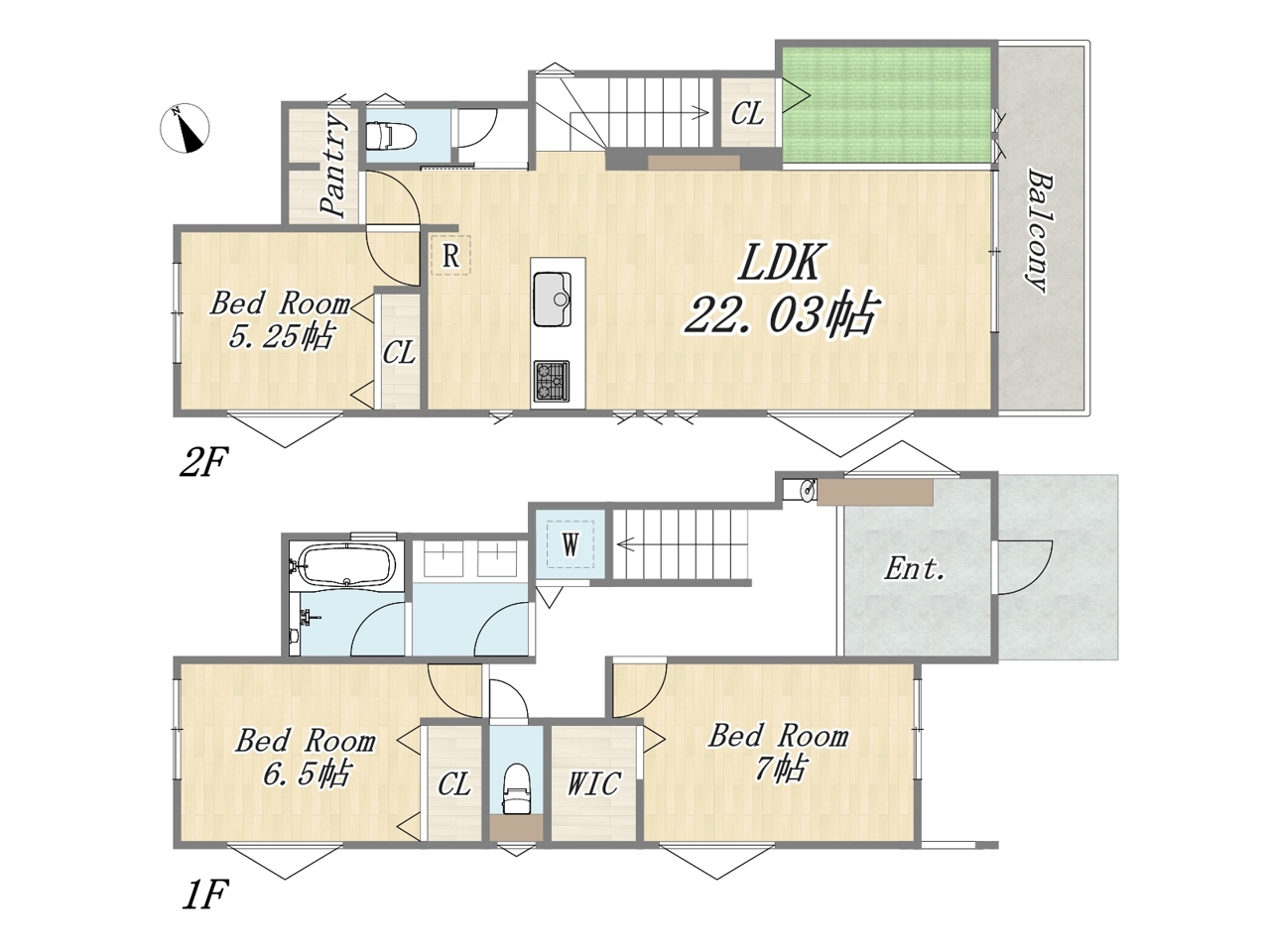 | 間取 | 3LDK+WIC+Pantry+小屋裏収納+カースペース (LDK23.6帖、洋室6.6帖、洋室6.5帖、洋室5.4帖) | ||