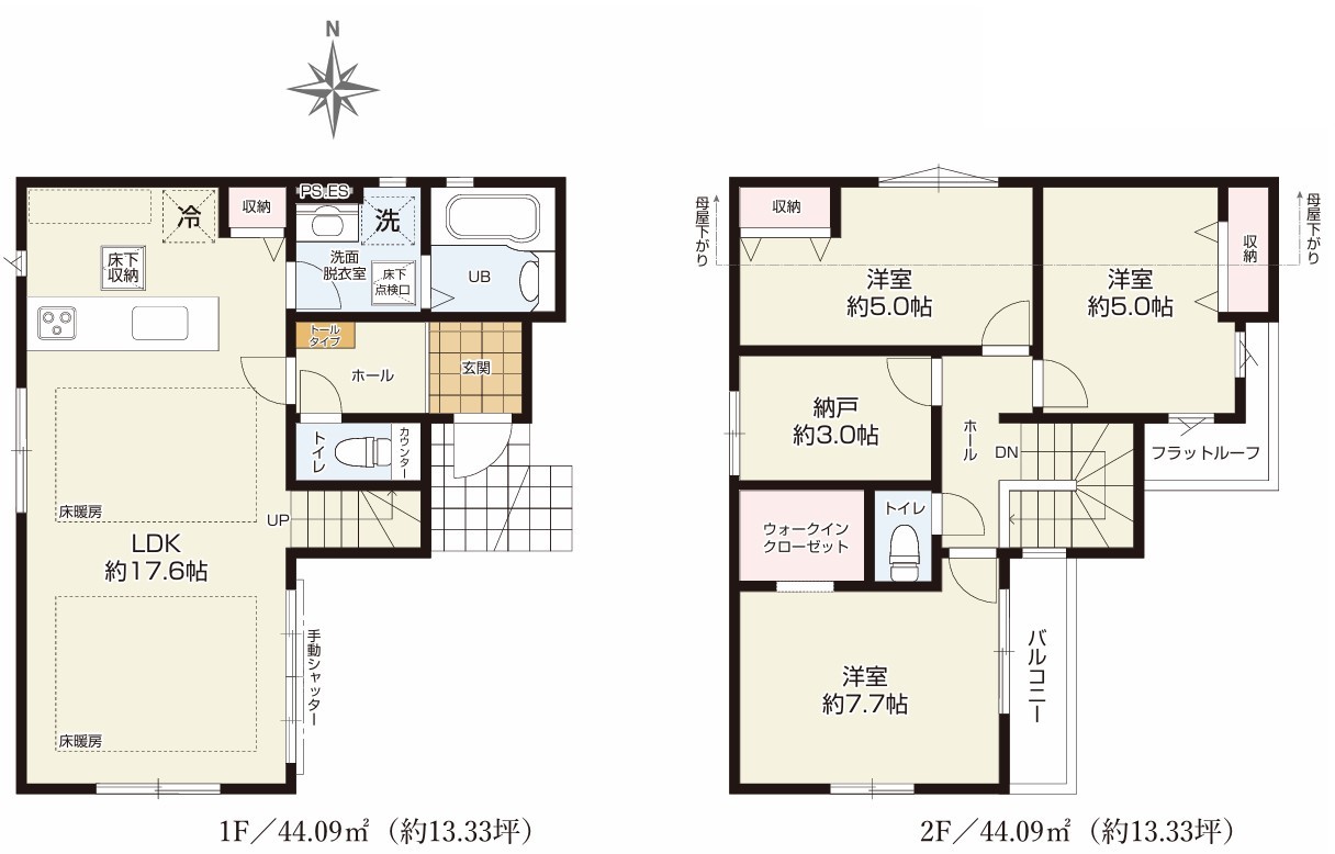 | 間取 | 3SLDK+WIC+Pantry+カースペース2台 (LDK17.6帖、洋室7.7帖、洋室5.0帖、洋室5.0帖、S3.0帖) | ||