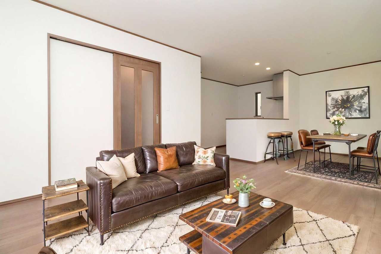A号棟 【LDK:16.62帖】 温かみのある木目調のリビングに空間の広がりを感じます。 本画像はCGで作成しており、実際に現地に家具は配置しておりません。また、価格に家具は含まれません。
