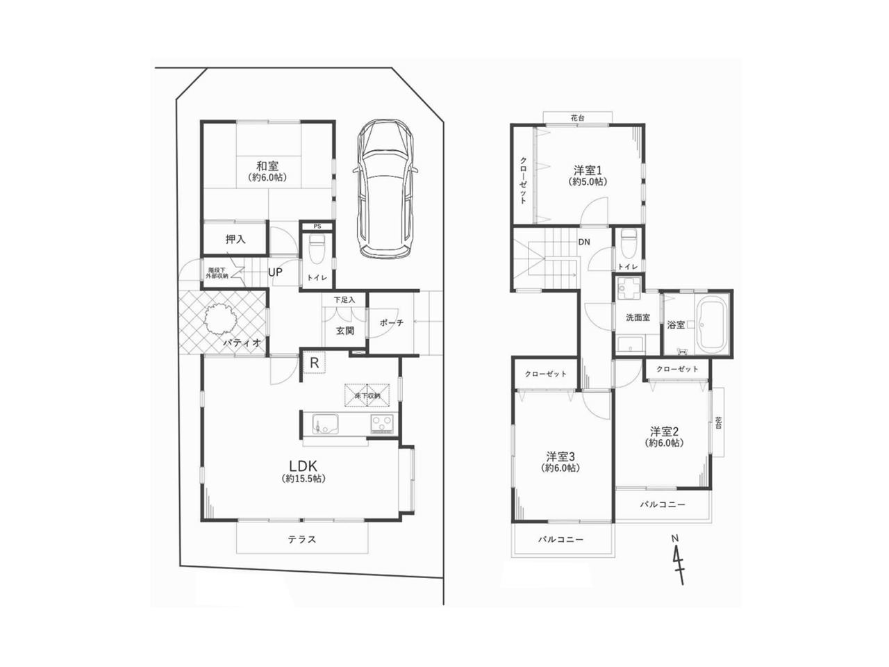 | 間取 | 4LDK+カースペース (LDK15.5帖、洋室6.0帖、洋室6.0帖、洋室5.0帖、和室6.0帖) | ||