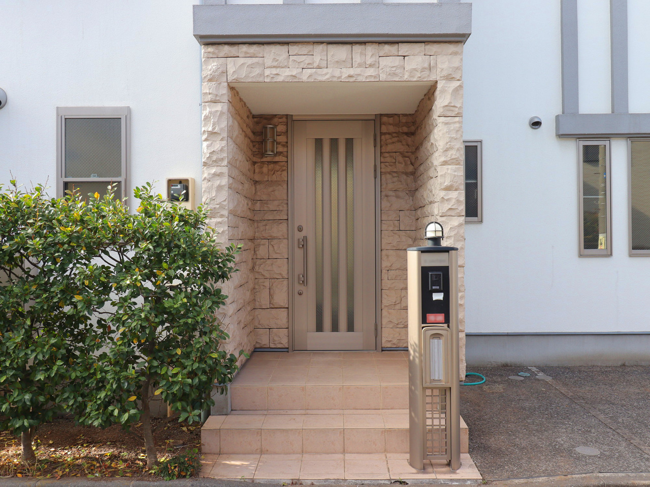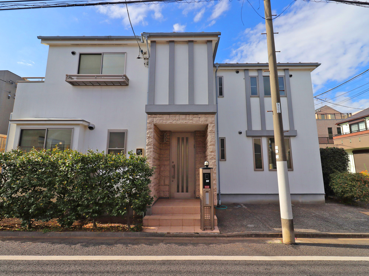 【外観】 清々しい空の下、洗練された佇まいが日々の暮らしに彩りを添える住まい。緑豊かな植栽とモダンな外観が調和し、心地よい穏やかさを感じさせます。