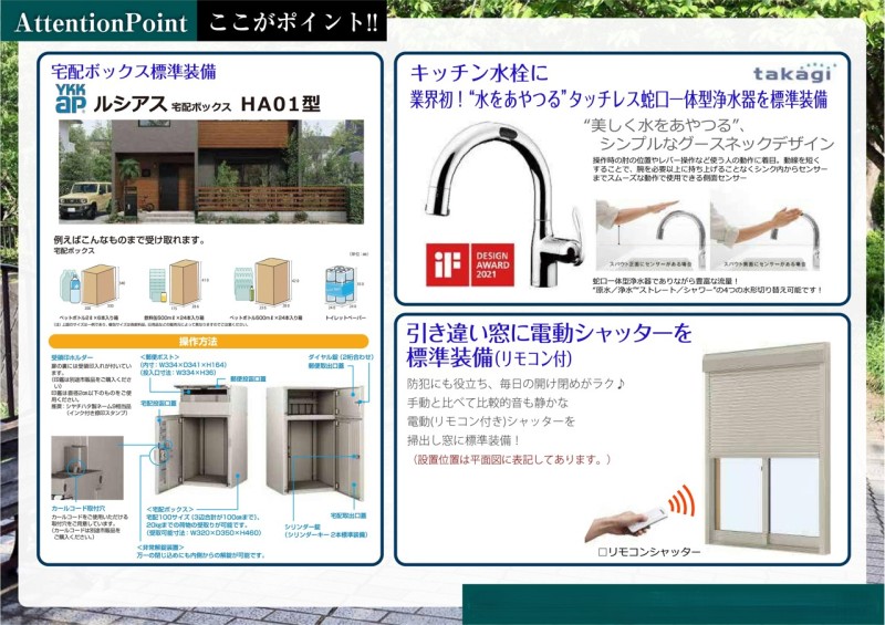平坦地緑豊かな住宅地閑静な住宅地地盤調査済LDK15帖以上耐震構造制震構造高気密高断熱住宅南向き全室2面採光南庭庭床下収納全居室収納ワイドバルコニー2面以上バルコニー複層ガラス床暖房食器洗浄機浄水器省エネ給湯器ガスコンロシステムキッチンカウンターキッチン3口以上コンロトイレ2ヶ所温水洗浄便座節水型トイレタンクレストイレシャワー付洗面台浴室乾燥機浴室暖房追焚機能浴室1坪以上浴室に窓オートバス全居室フローリングリビング階段ウォークインクローゼットシューズインクローゼットバリアフリー仕様TVモニタ付インターホンスマートキービルトガレージ高速ネット対応電動シャッターノンホルムアルデヒド24時間換気システム小学校800m以内保育園・幼稚園800m以内コンビニ400m以内公園800m以内陽当り良好通風良好フラット35Sに対応フラット35・S適合証明書