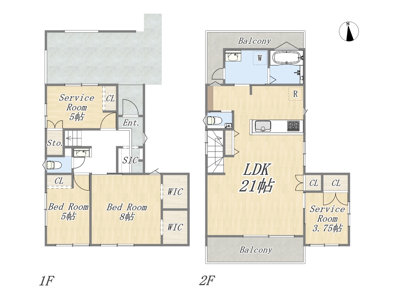 | 間取 | 2LDK+2S+2WIC+ビルトインガレージ (LDK21帖、洋室8帖、洋室5帖、S5帖、S3.75帖) | ||