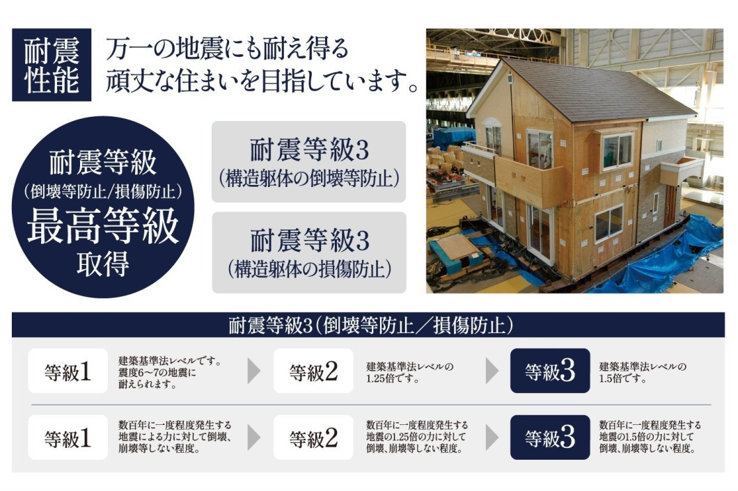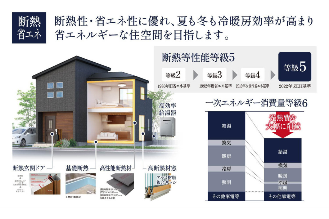 建物は断熱等性能等級5/一次エネルギー消費量等級6をクリアするZEH水準仕様を標準とし、耐震等級3も取得前提の高品質な建物をご提案。省エネで快適な暮らしが叶います。