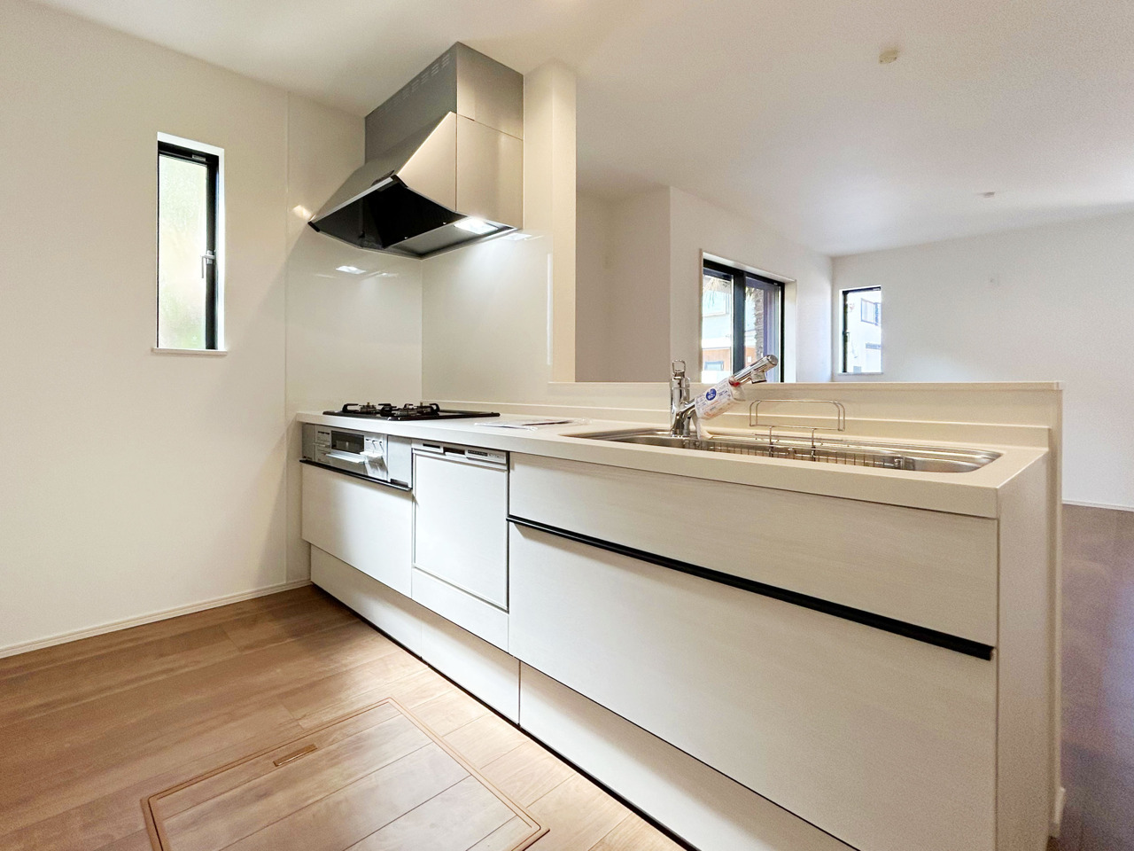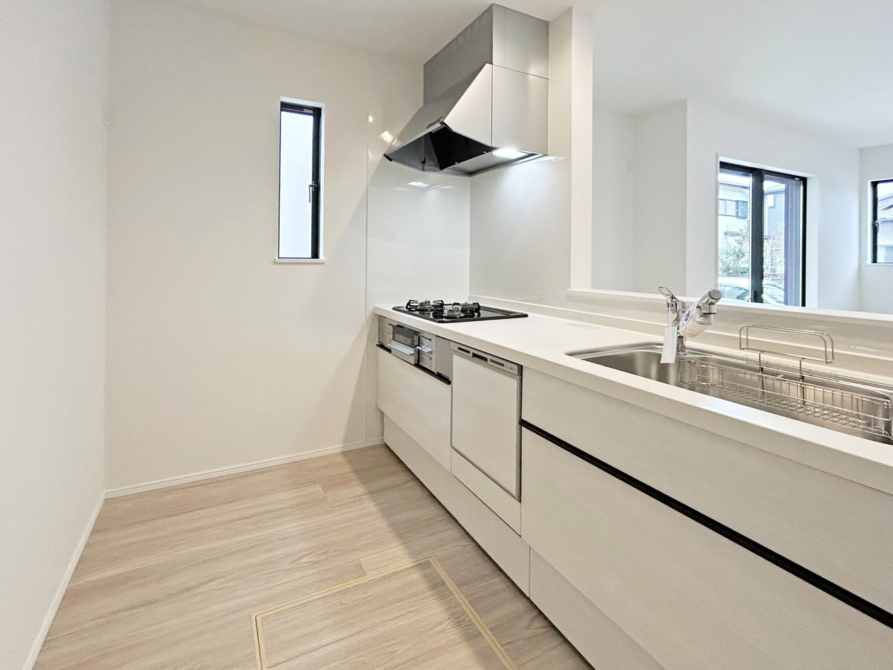 カースペースもしっかり確保。キッチン・洗面・浴室などの水回りが集約され、家事動線良く効率的に作業を行えるプランニング。