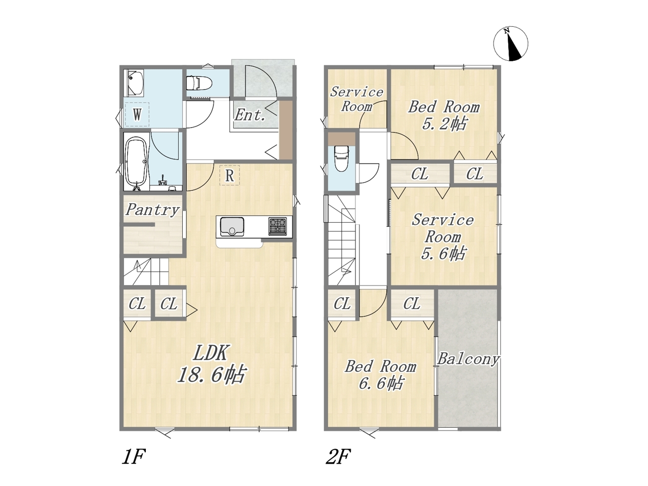 | 間取 | 2LDK+2S+Pantry+ワイドバルコニー+カースペース2台 (LDK18.6帖、洋室6.62帖、洋室5.2帖、S5.6帖) | ||