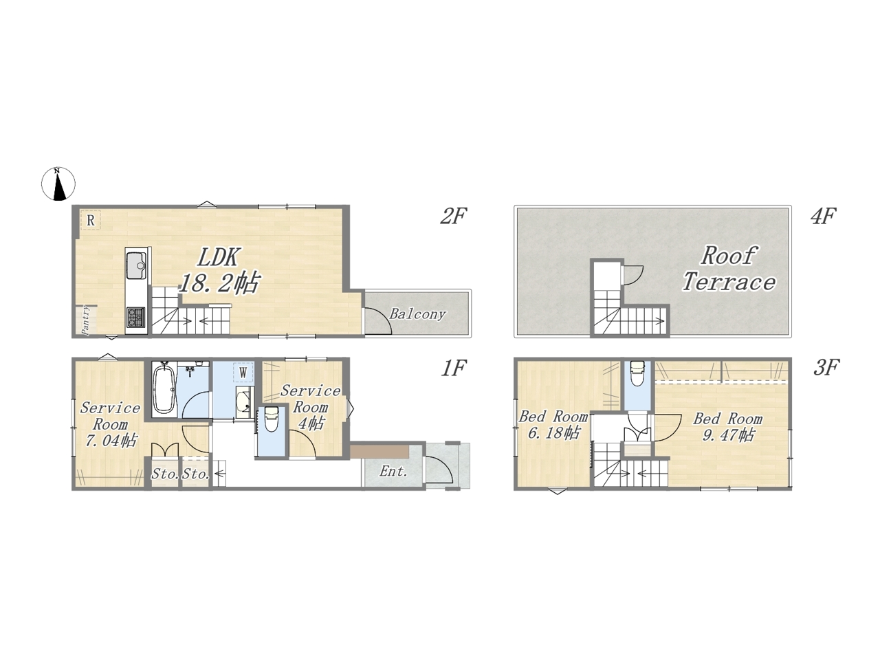 | 間取 | 2LDK+2S+Pantry+Roof Terrace (LDK18.2帖、洋室9.47帖、洋室6.18帖、S7.04帖、S4帖) | ||